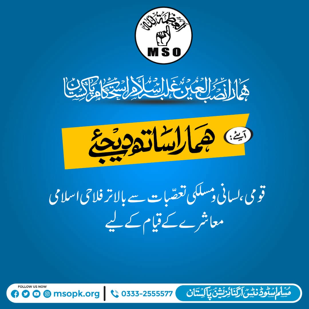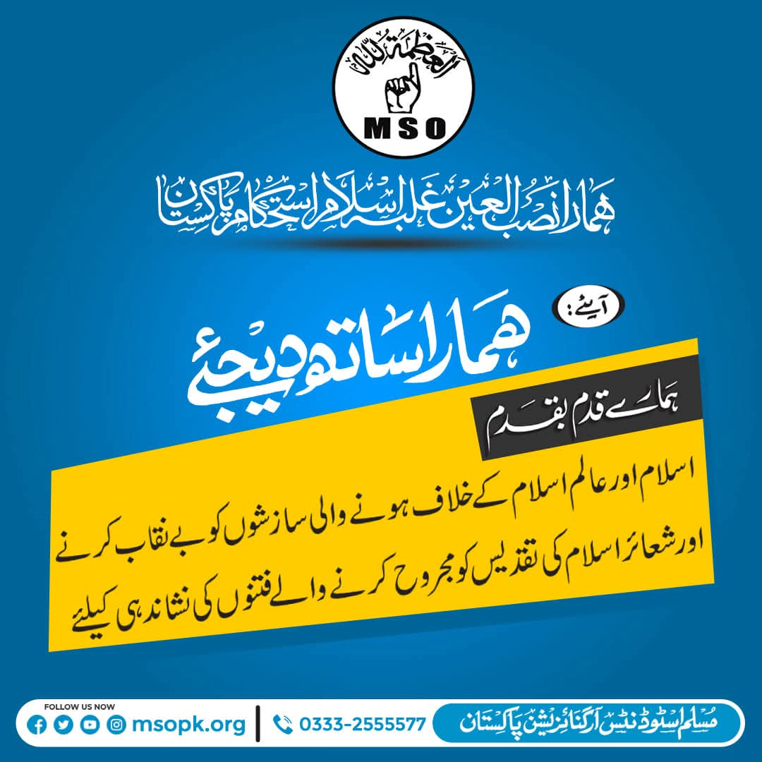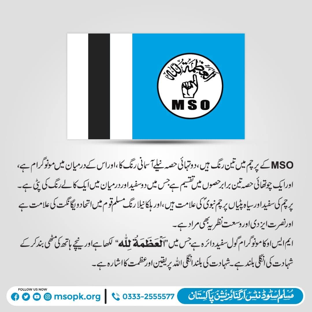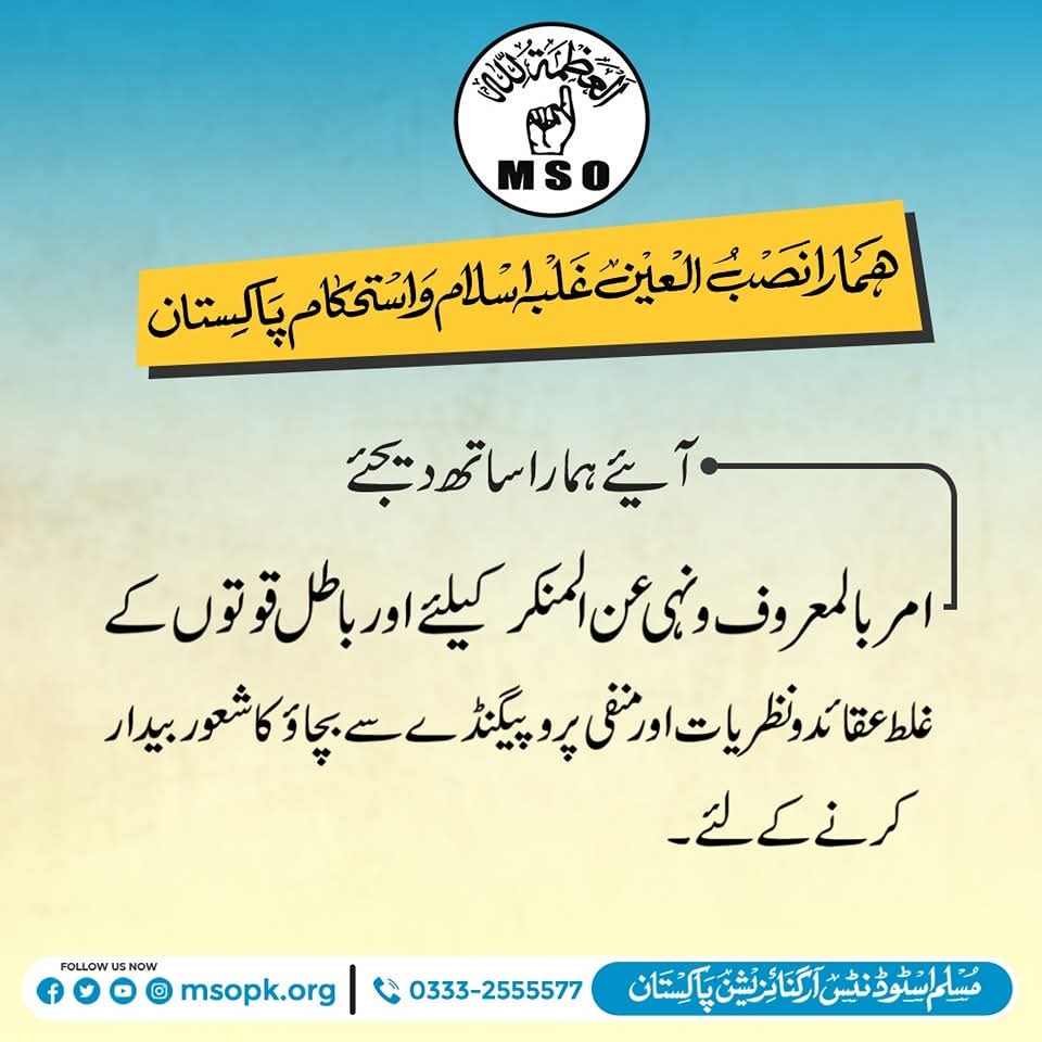 MSO is a self-governed, autonomous and an ideological version of Students which holds its distinct aim and objectives focused upon the formation of a reformed society adhering the Holy Prophet Mohammad SAWW and Sahaba R.Z as the role model. It came into existence on 11th of January 2002. MSO is the solitary student group which is simultaneously working in Religious as well as non-religious educational institutes. Operationalizing contrarily than other student organizations, MSO is working solely for the reformation of personal character and ideological of the young generation. Core Theme of Muslim Students Organization.