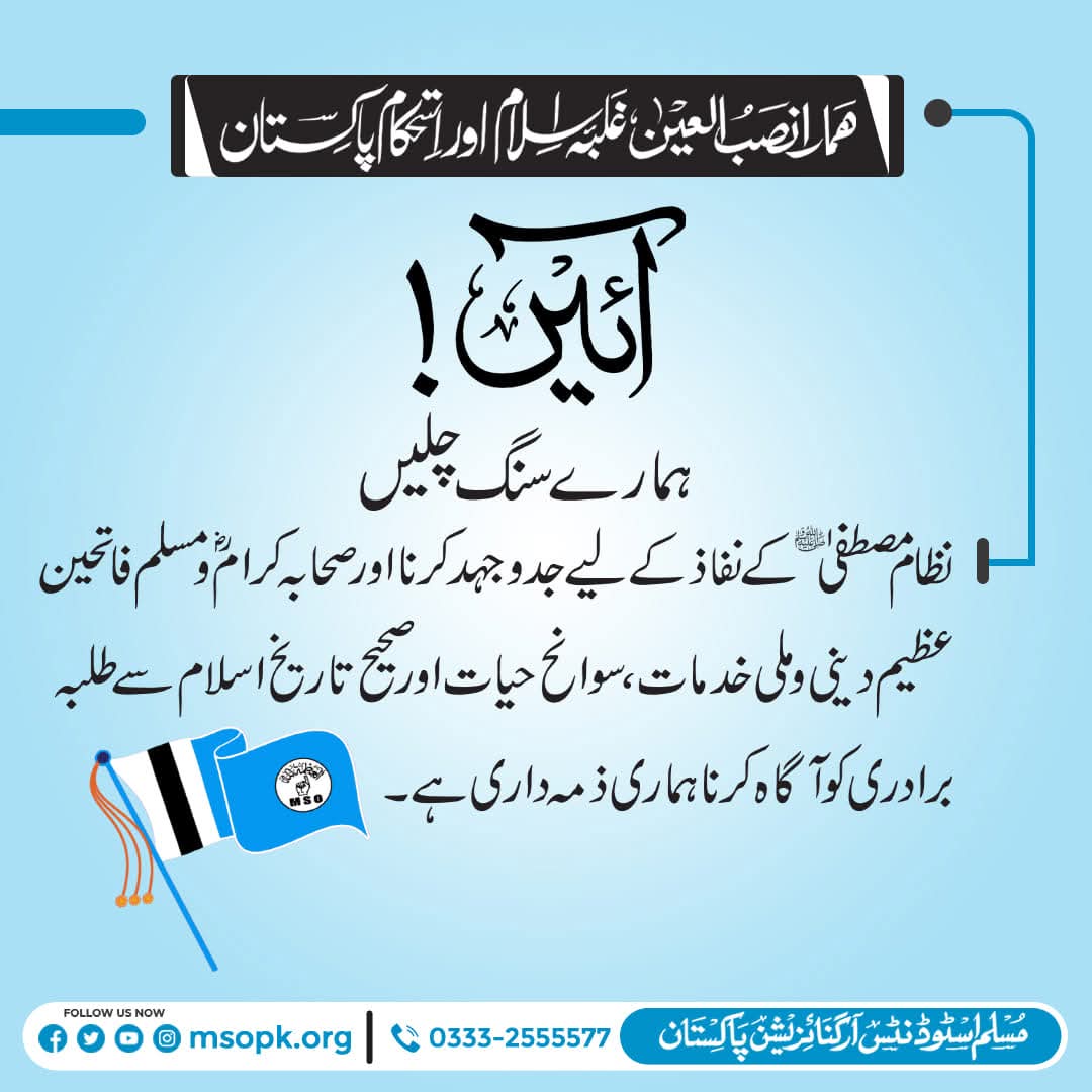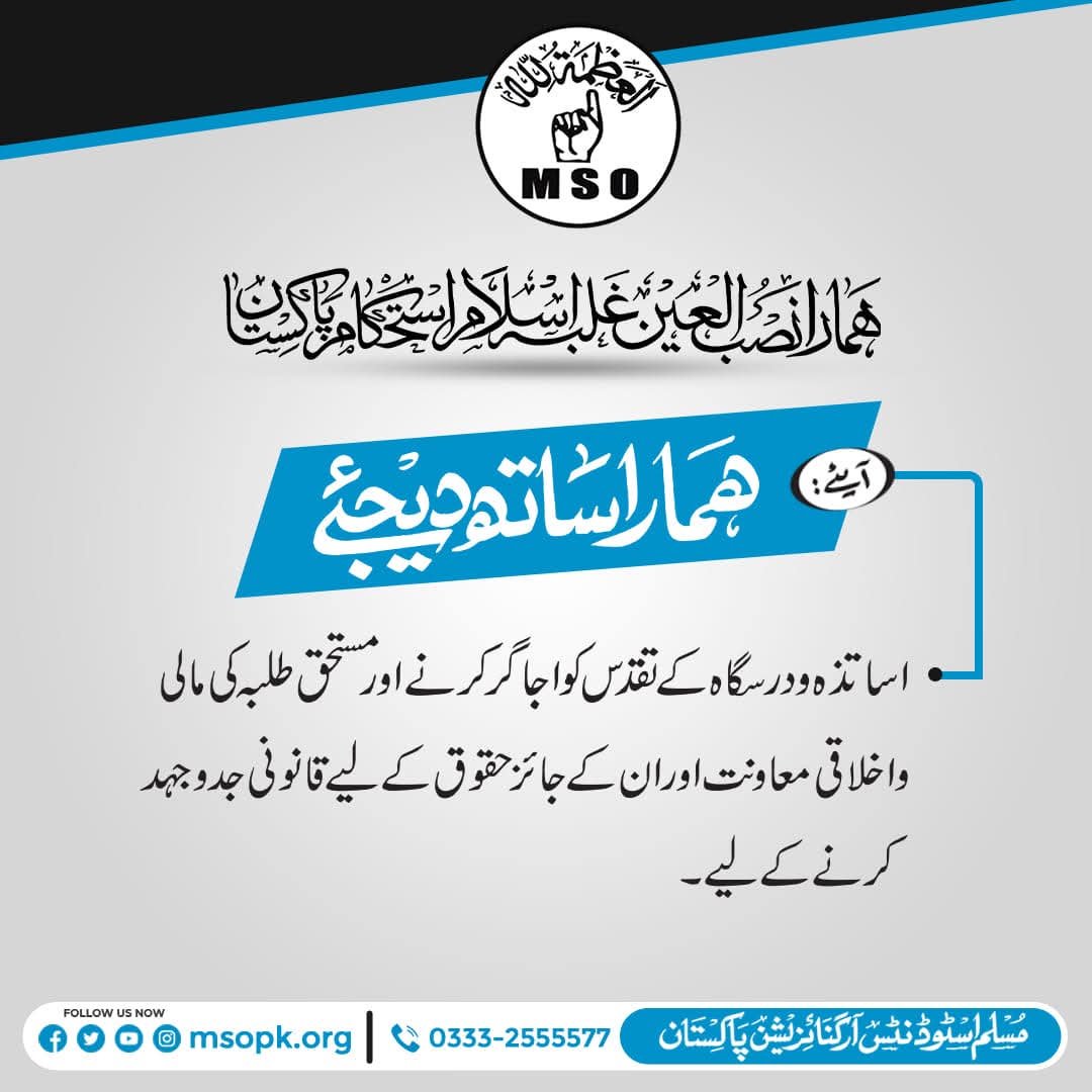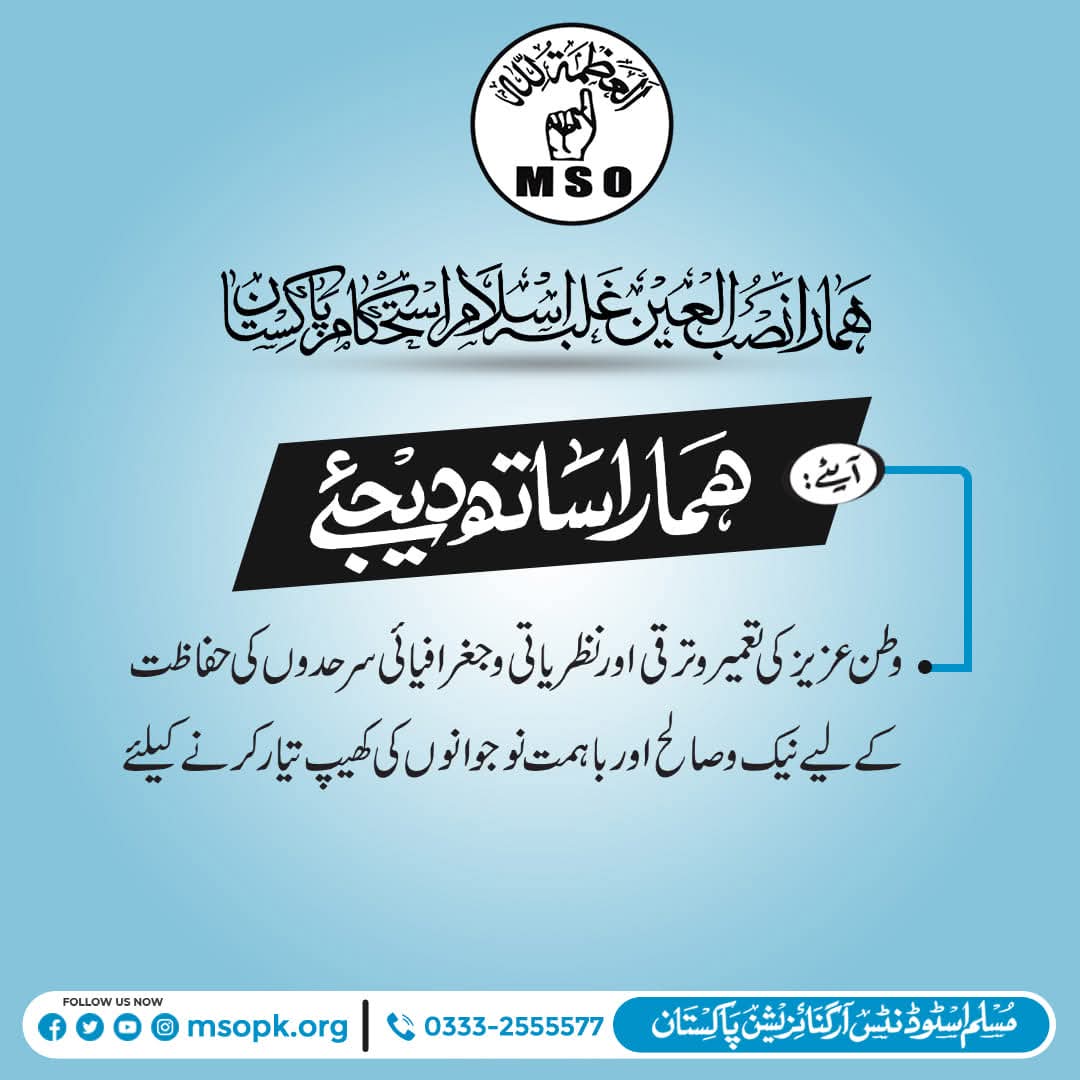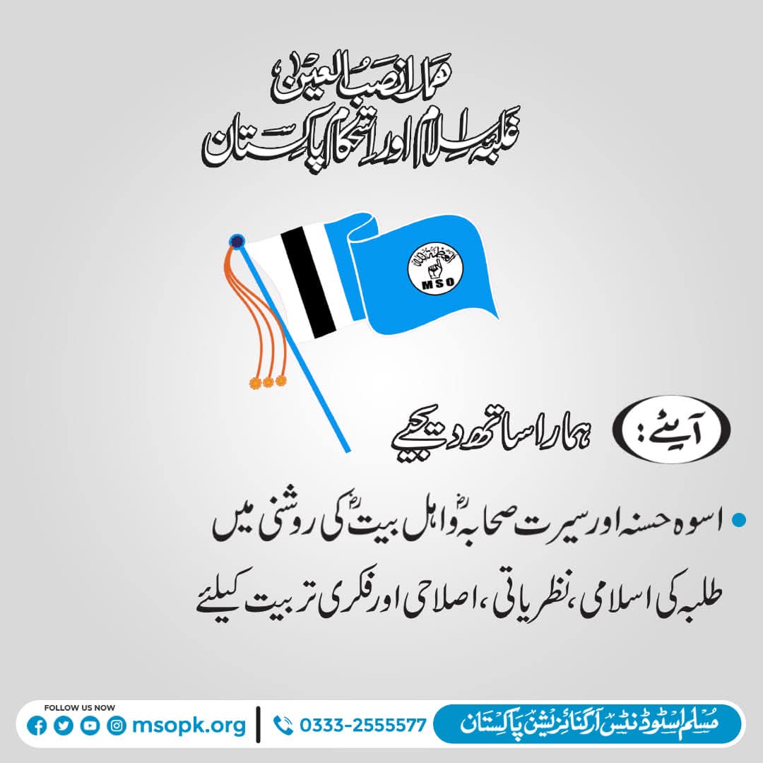 MSO is a self-governed, autonomous and an ideological version of Students which holds its distinct aim and objectives focused upon the formation of a reformed society adhering the Holy Prophet Mohammad SAWW and Sahaba R.Z as the role model. It came into existence on 11th of January 2002. MSO is the solitary student group which is simultaneously working in Religious as well as non-religious educational institutes. Operationalizing contrarily than other student organizations, MSO is working solely for the reformation of personal character and ideological of the young generation. Core Theme of Muslim Students Organization.